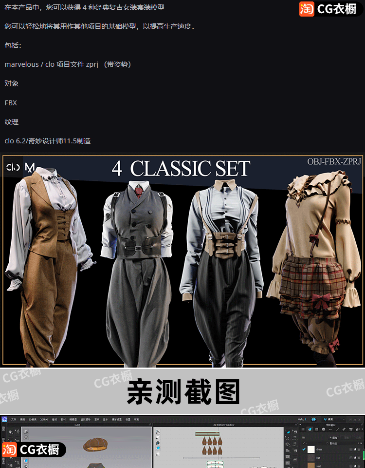 MD衣服素材CLO女式古典复古风女装套装4款服装设计打版纸样3D素材