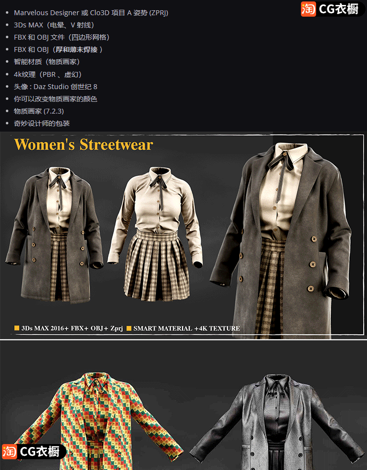 MD衣服素材CLO女式角色皮革服装套装Marvelous服装3D素材ZPRJ纸样