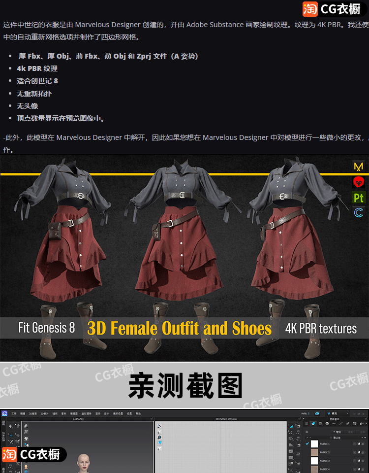MD/CLO3D衣服素材ZPRJ中世纪风女刺客披风套装服装打版FBX模型OBJ