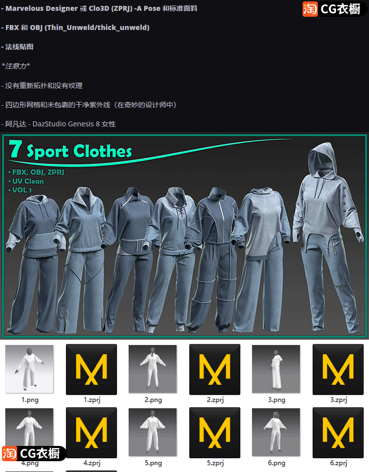 CLO/MD模型素材7套女性运动服冬季休闲运动风格女装套装衣服纸样