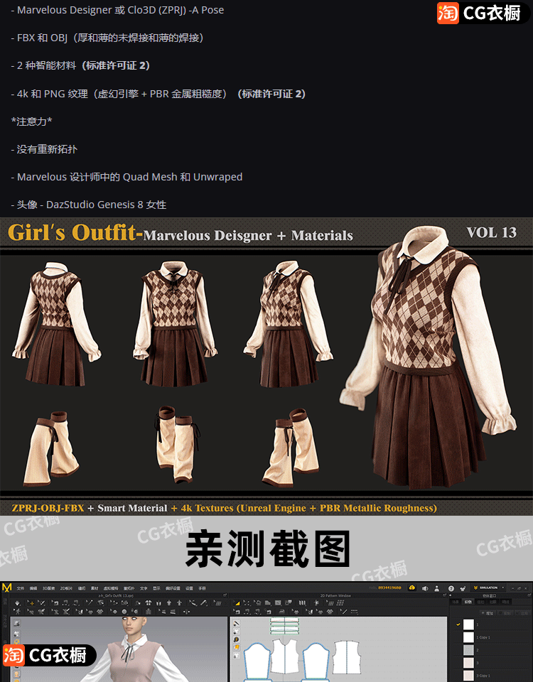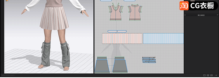 MD衣服模型CLO3D素材复古百褶裙子套装加腿袜3D纸样模型ZPRJ工程