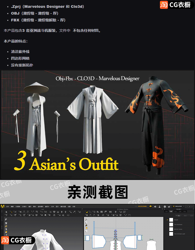 MD衣服CLO3D服装模型3款亚洲古风侠客仙侠套装3D纸样工程源文件