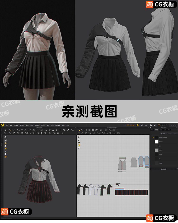 CLO3D服装素材MD模型裙子制服女装百褶裙衬衫套装ZPRJ纸样工程