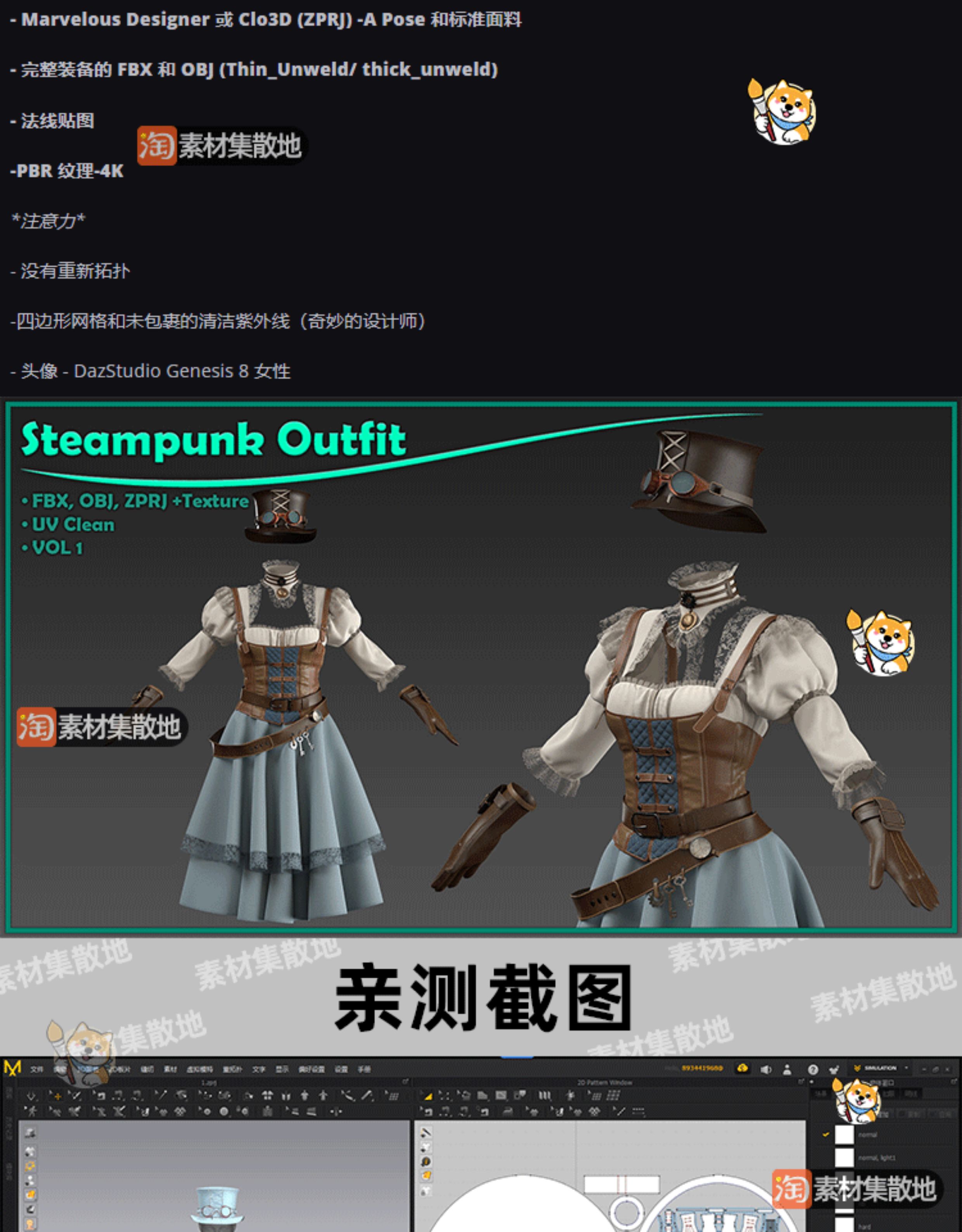 clo女性蒸汽朋克3D服装复古女连衣裙帽子皮手套ZPRJ模型打版文件