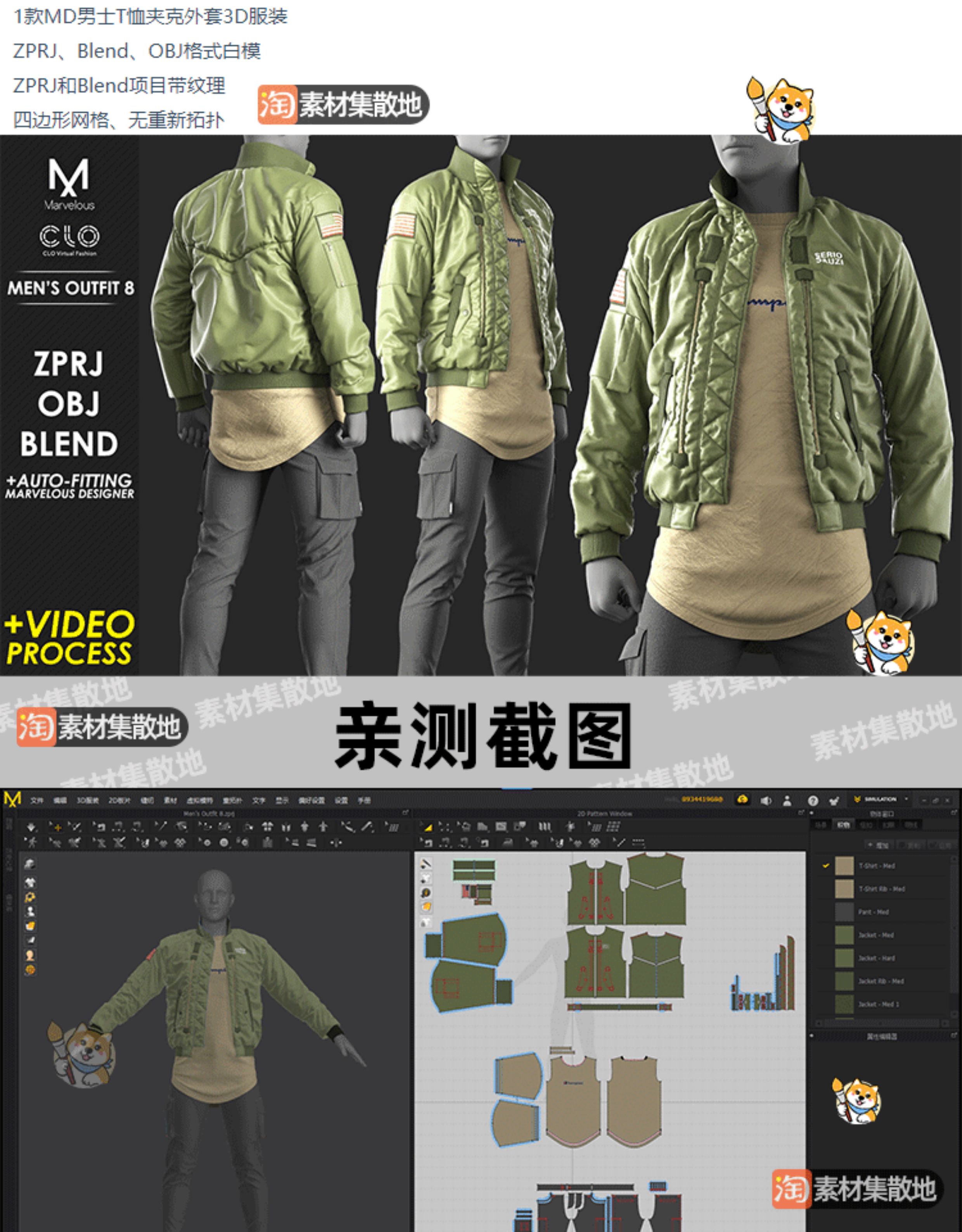 clo3d服装男士T恤夹克外套长裤休闲裤套装ZPRJ模型打版工程源文件