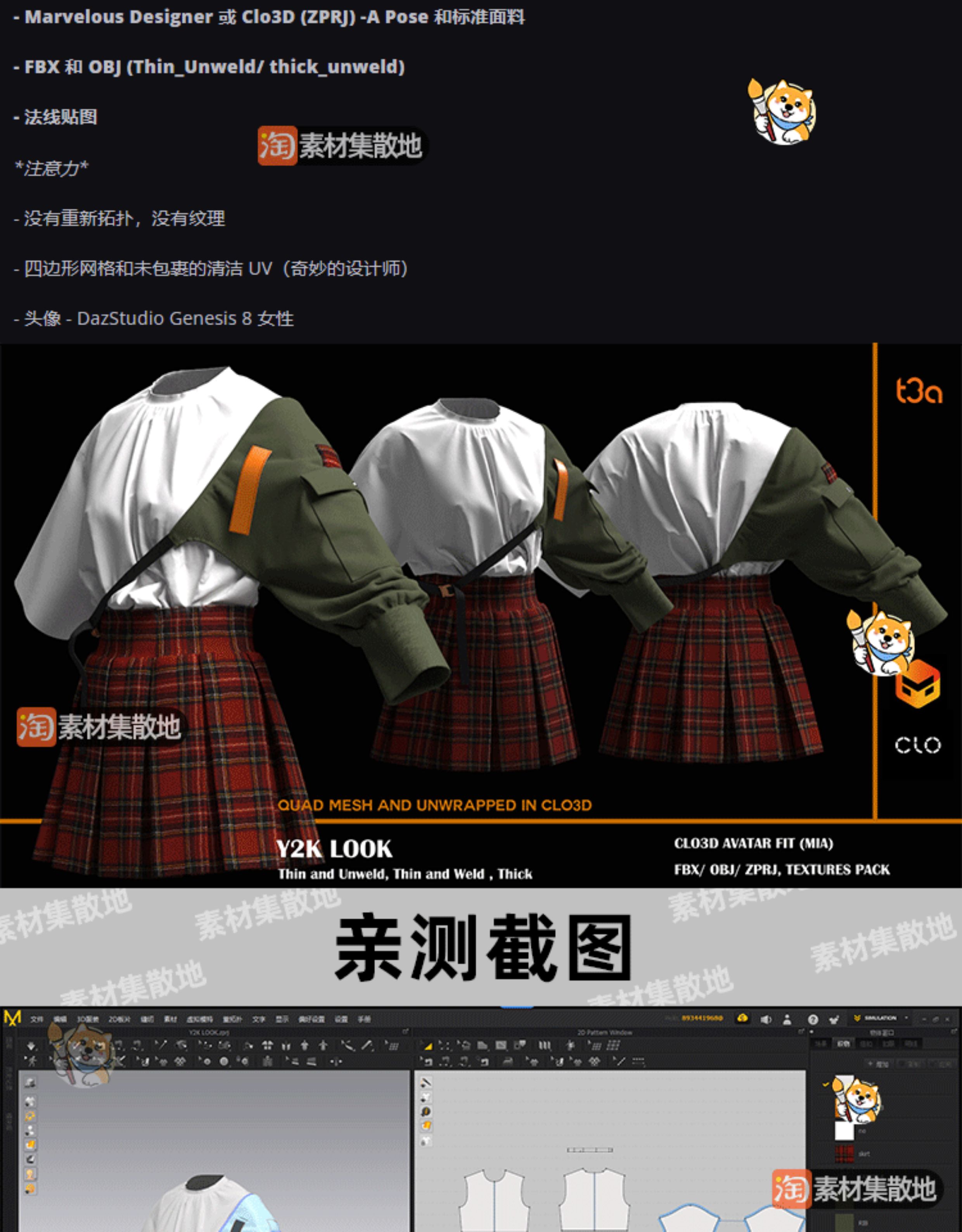 MD格子百褶裙上衣套装CLO女性短裙服装ZPRJ模型打版源文件3D服装