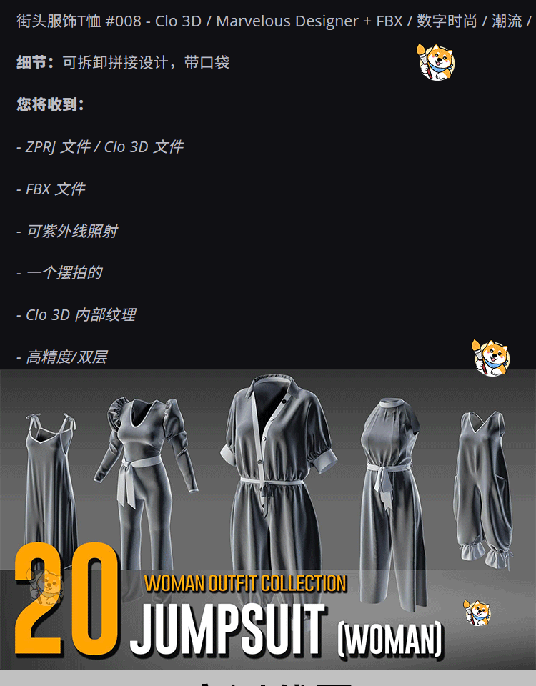 Marvelous衣服CLO3D素材20款女士贴身连体衣街头服饰T恤3D模型