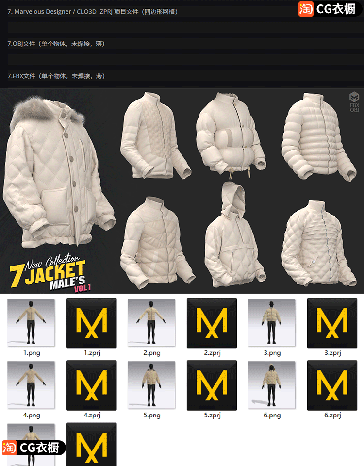 CLO3D服装模板MD衣服模型7款男士夹克厚外套棉衣服3D模型ZPRJ工程