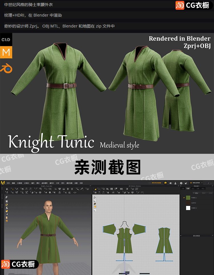 MD衣服CLO3D模型中世纪骑士束腰外套3D纸样ZPRJ工程源文件素材OBJ