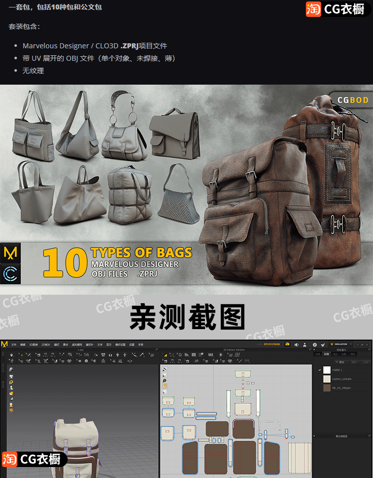 MD/CLO3D包包模型10款包背包手提包公文包ZPRJ纸样工程源文件素材