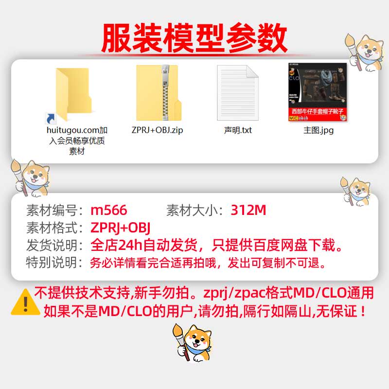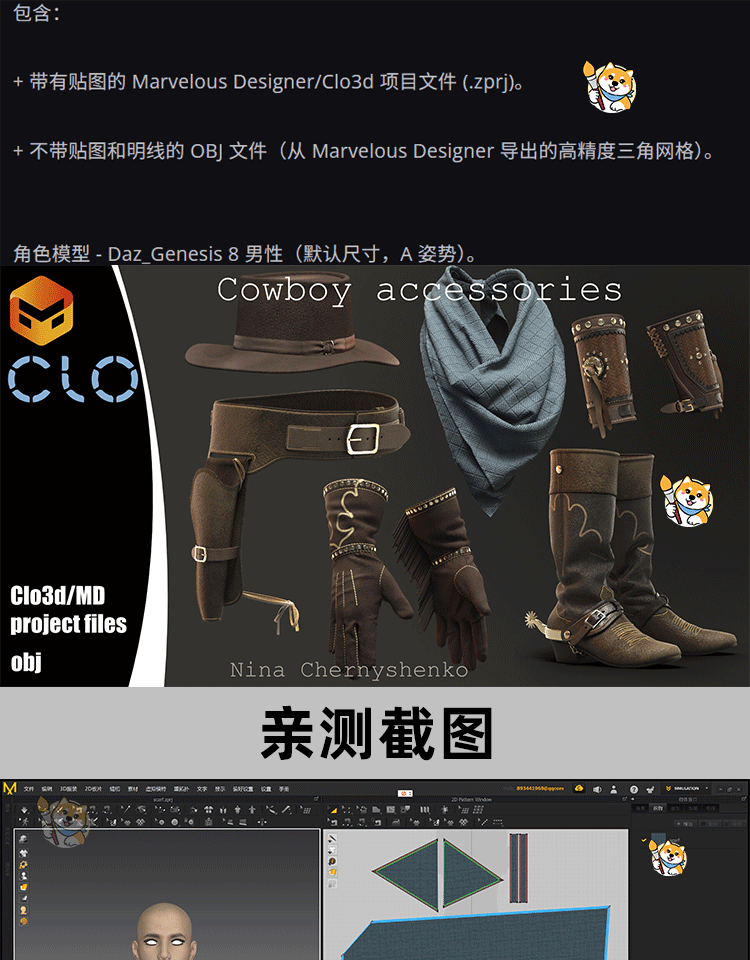 MD/Clo3D衣服模型西部牛仔手套帽子靴子服装纸样版片3D模型素材