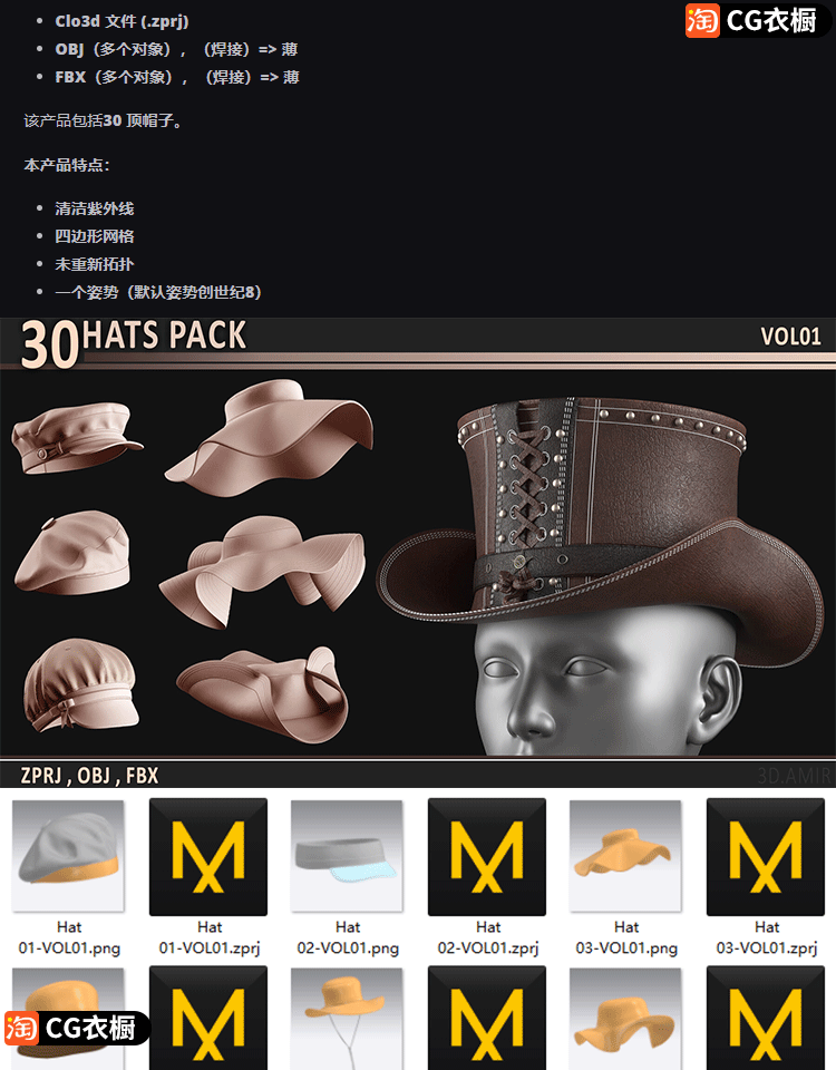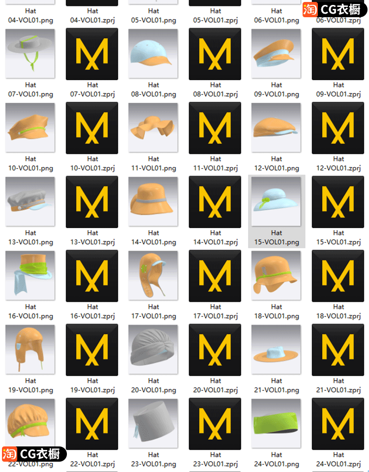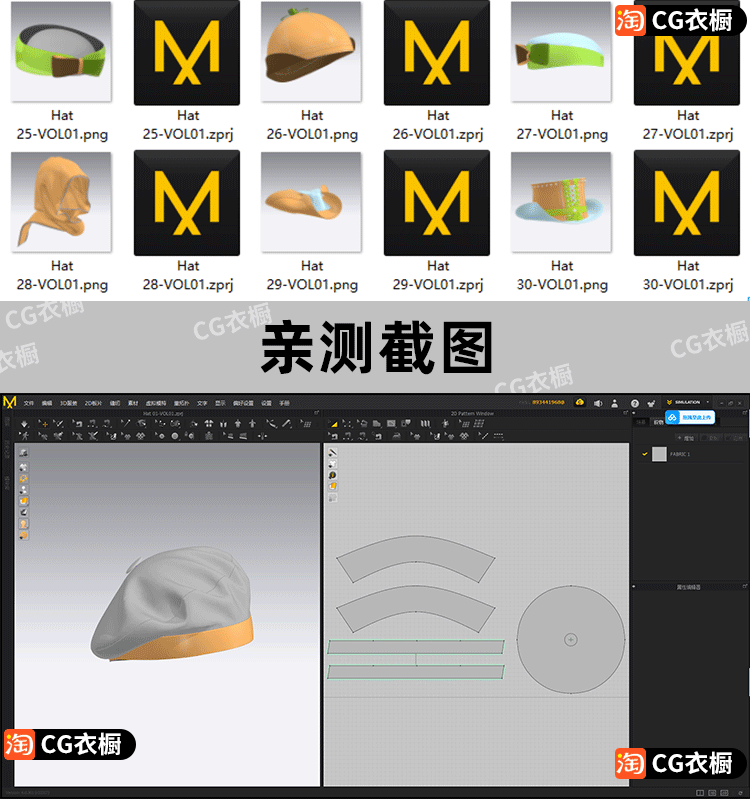 MD素材文件CLO3D帽子系列纸样模型文件ZPRJ帽子基础版型 工程文件
