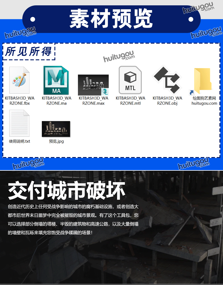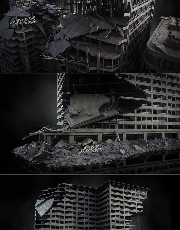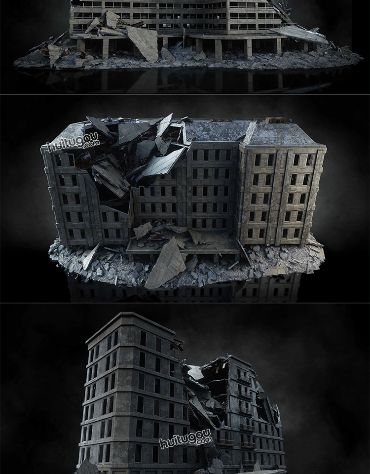 城市都市战区灾区建筑废墟末日楼房场景3D模型Kitbash3D-WARZONE