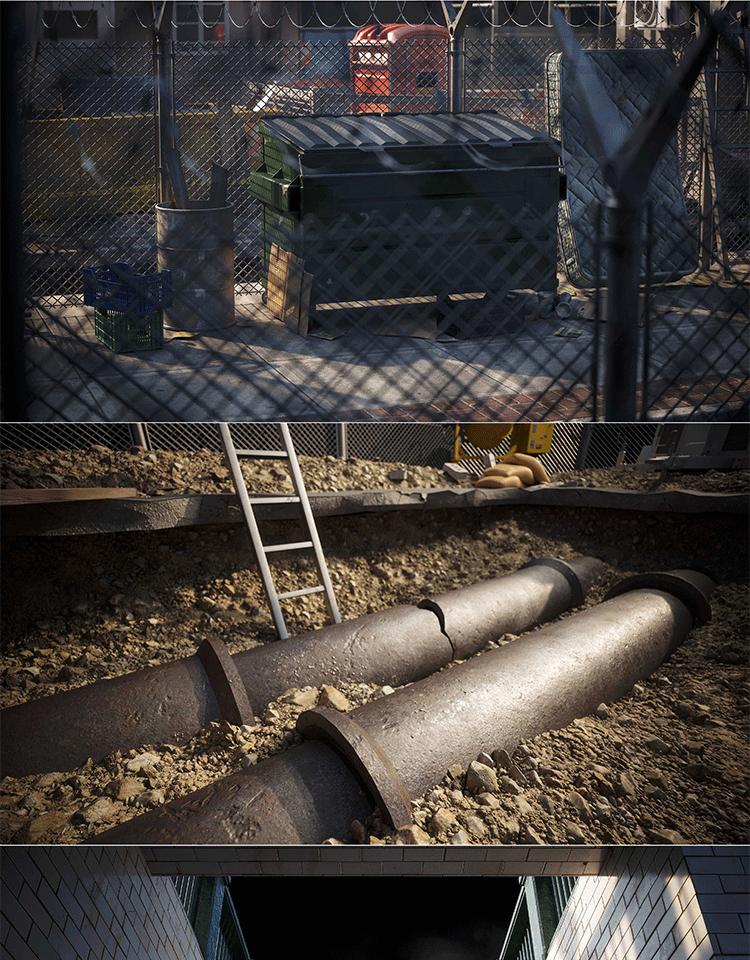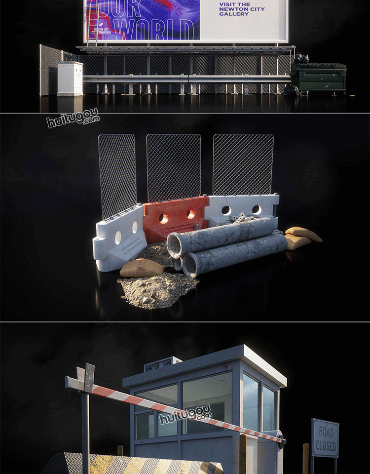 PBR停火战区设施废墟破损工地瞭望塔栅栏建筑3D模型Kitbash3D-DMZ