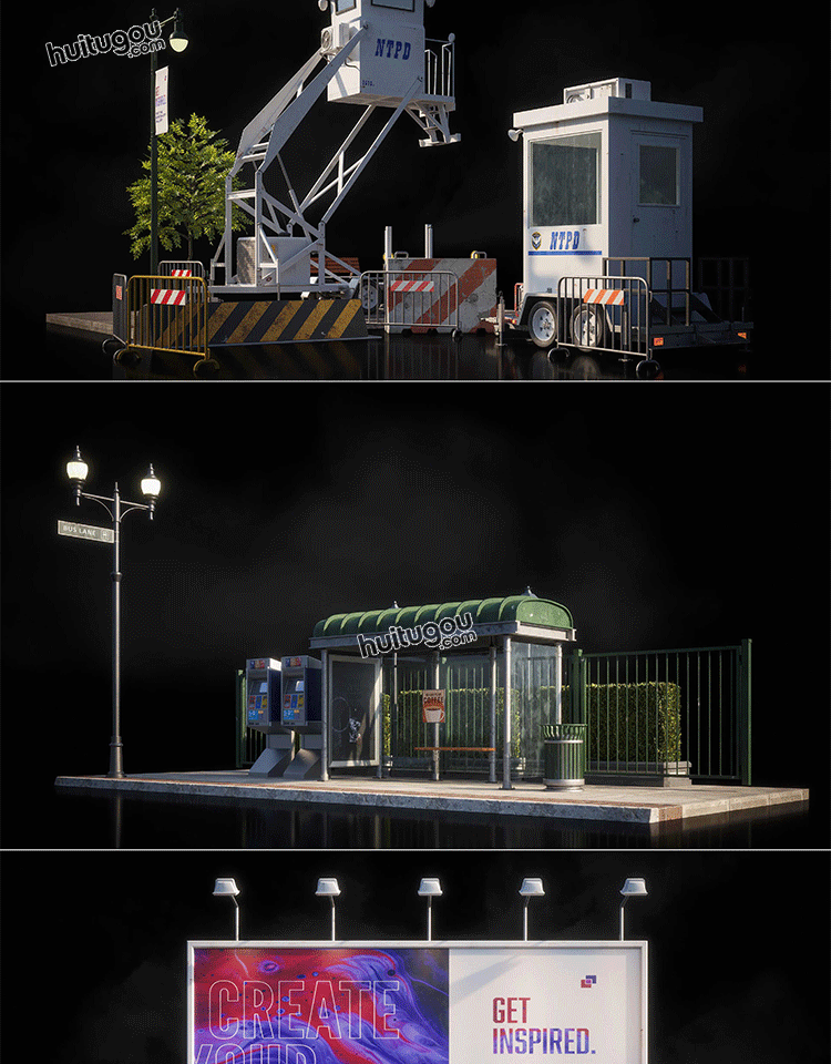 100个Blend街道公共设施基础模型3D素材路牌路灯路障垃圾桶公交站
