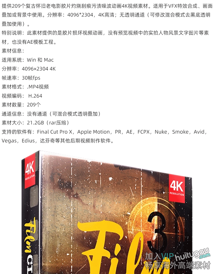 209个复古怀旧老电影胶片灼烧刮痕污渍噪波动画4K视频VFX特效合成
