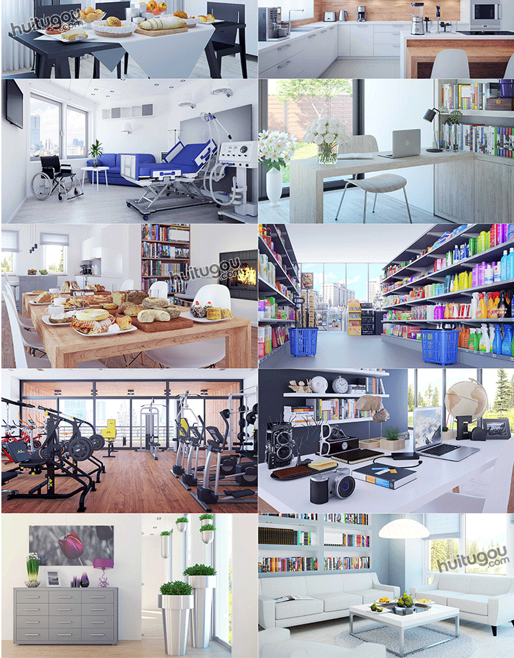 Interiors[室内整体模型]餐厅厨房健身房医院3D场景模型MAX C4D