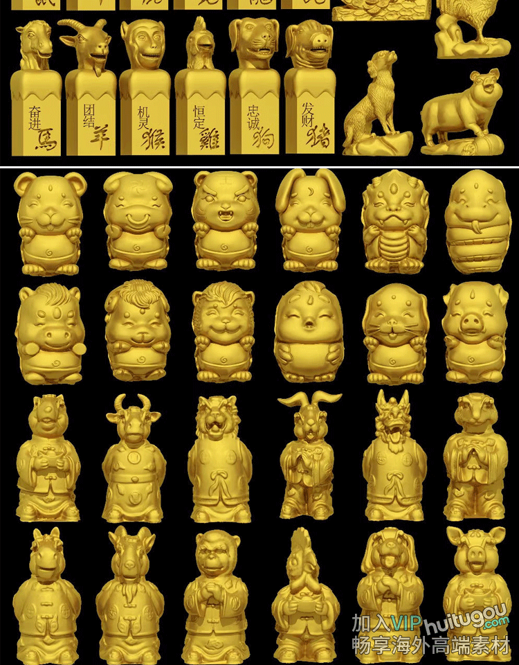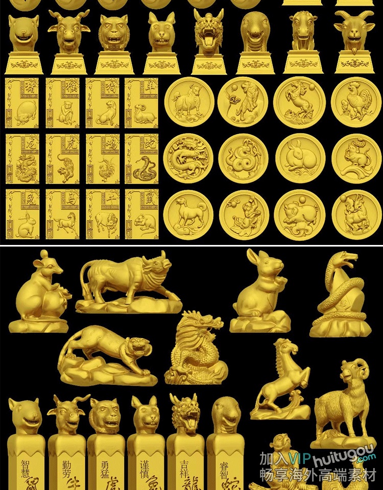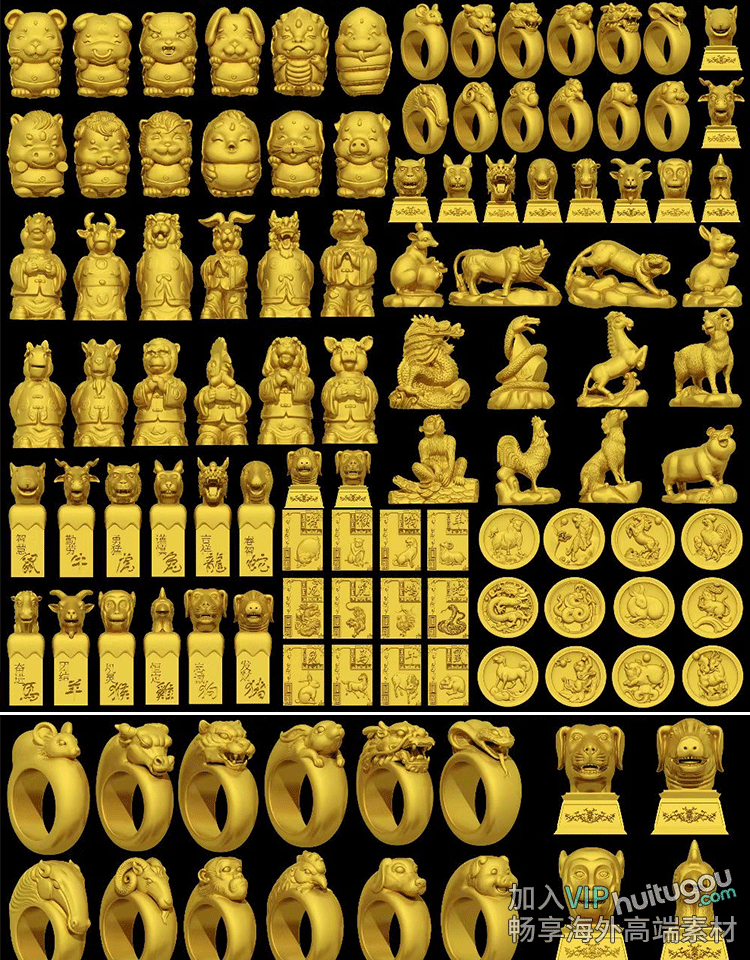十二生肖动物戒指头像玉牌印章圆雕图STL文件3D打印模型图纸合集