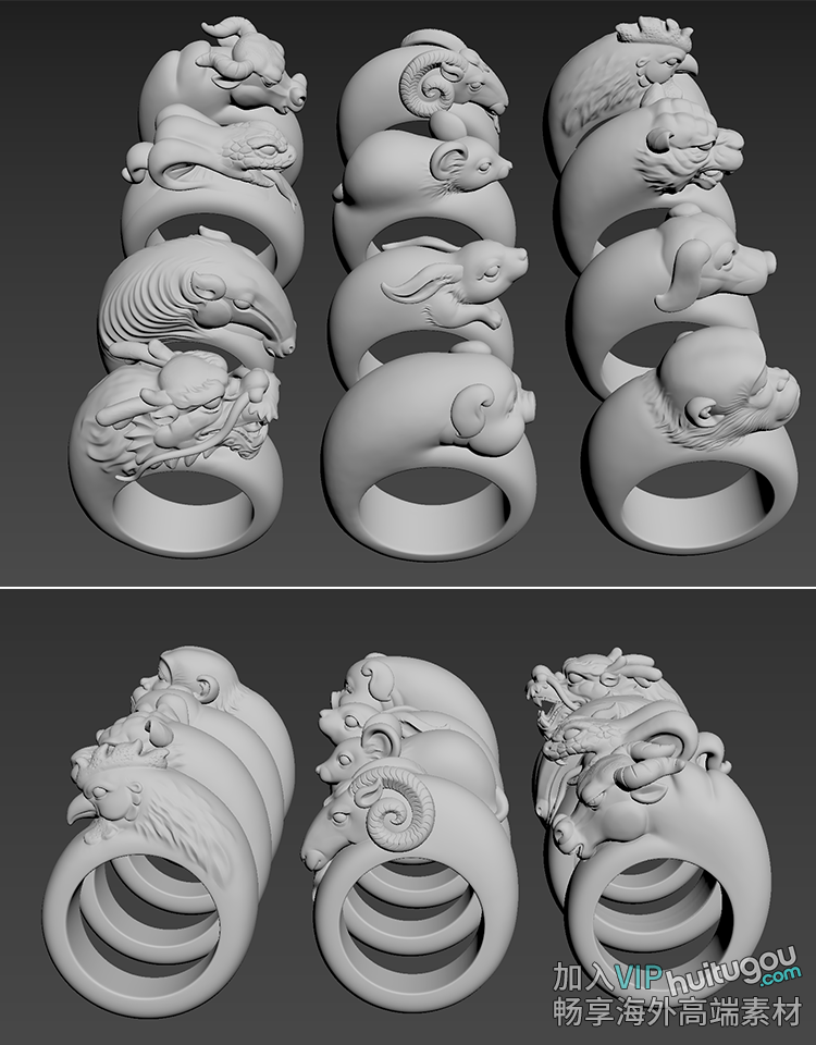 十二生肖戒指鼠牛虎兔龙蛇马羊猴鸡狗猪指环雕刻stl机雕3D打印图