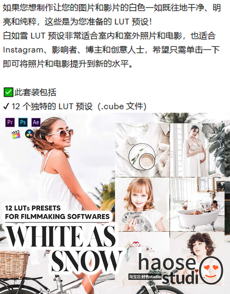 Pr剪映达芬奇调色LUT预设 洁白明亮通透LUT调色12款White As Snow