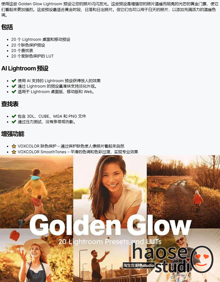 Lr调色预设滤镜PS日出日落温暖增强LUT视频调色20款Golden Glow