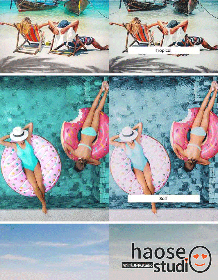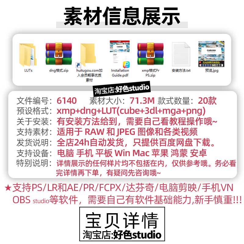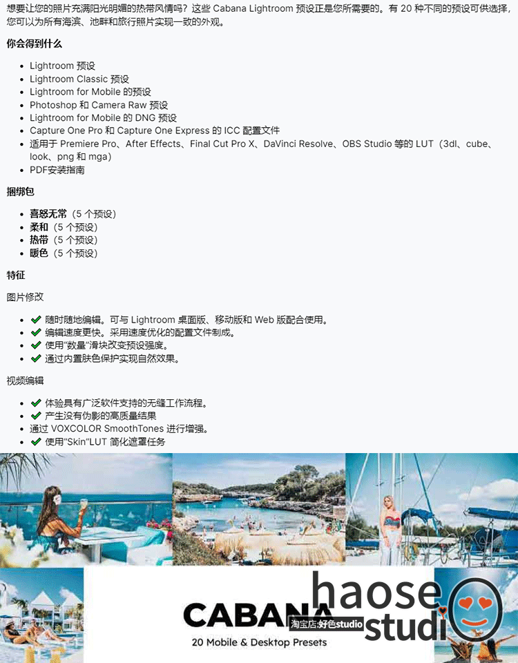 Lr预设PS滤镜LUT调色达芬奇OBS直播间阳光热带风情调色20款Cabana