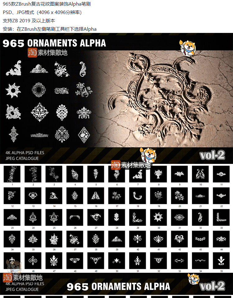 ZBrush阿尔法纹理965款复古花纹装饰Alpha贴图jpg/psd格式素材