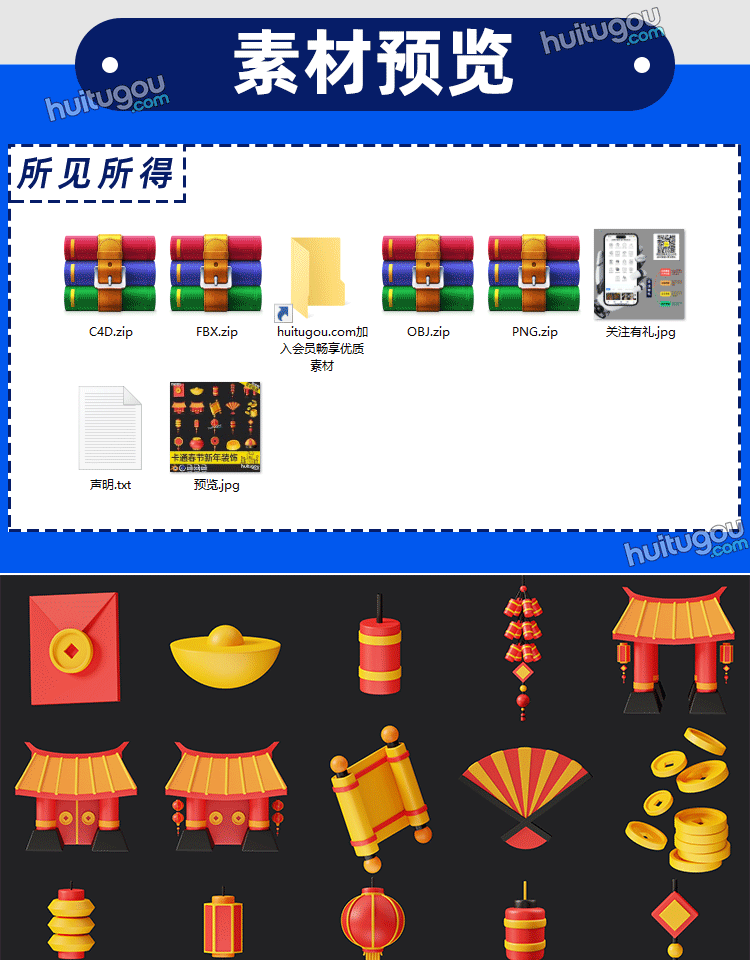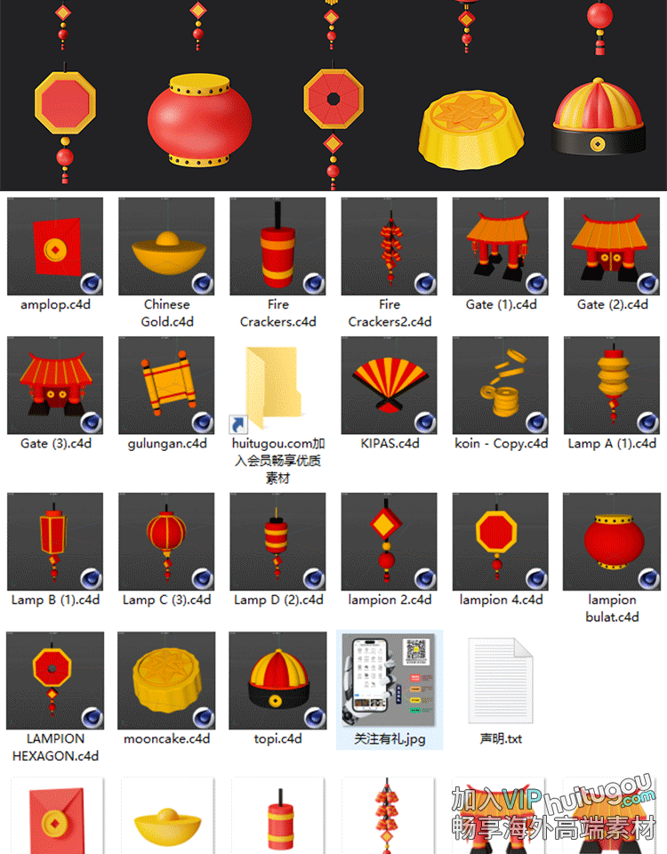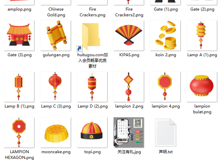 C4D卡通春节新年装饰png图标3D模型OBJ中国风元素卷轴庙宇灯笼鼓