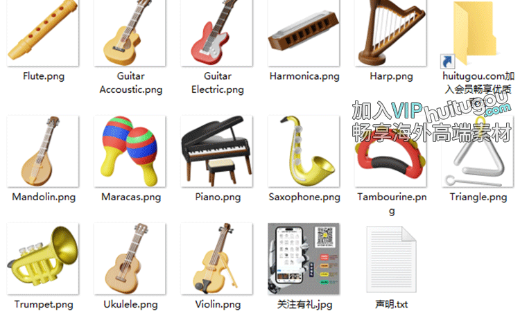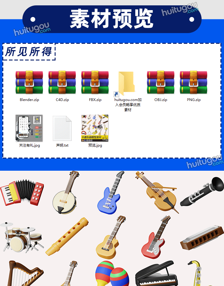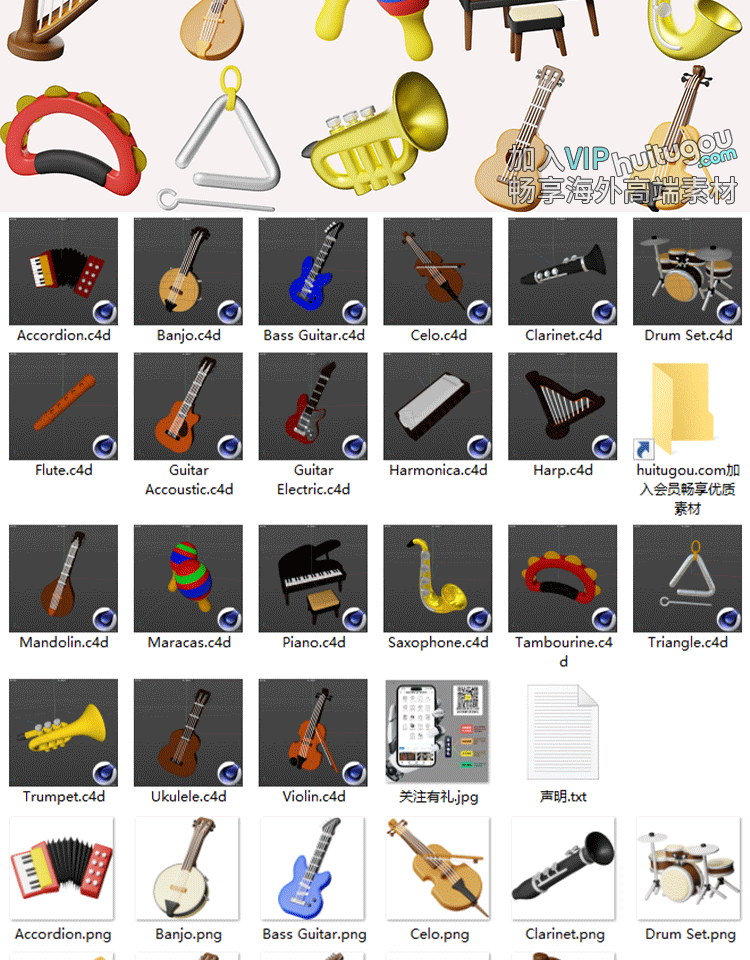 blender卡通乐器模型素材C4D吉他竖琴唢呐FBX音乐用品OBJ格式png