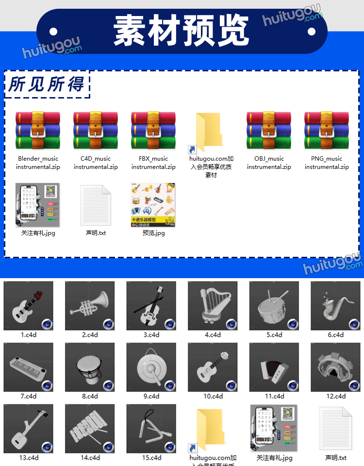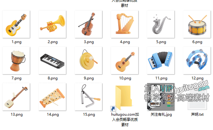 blender卡通乐器模型素材C4D吉他竖琴唢呐FBX音乐用品OBJ格式png