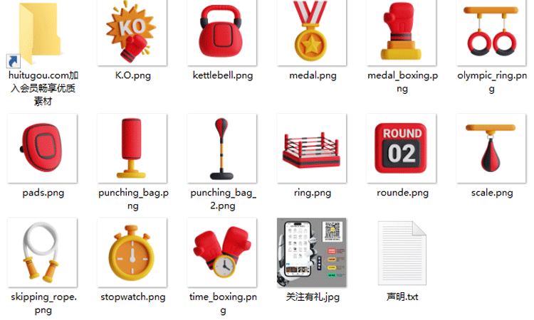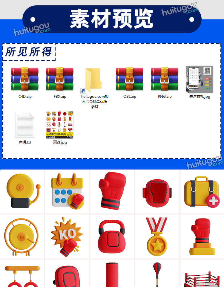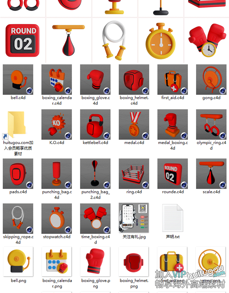 C4D运动拳击手套3D模型跳绳FBX素材壶铃奖章OBJ格式急救包PNG图标