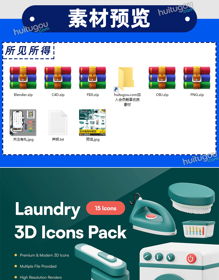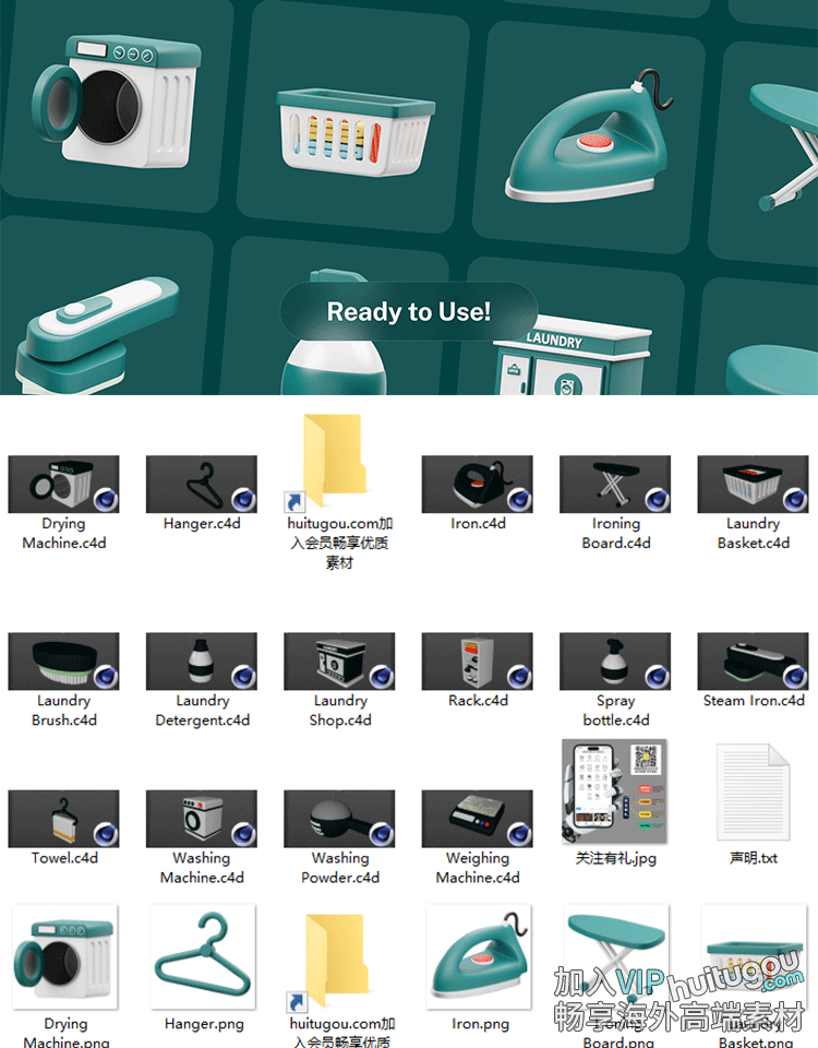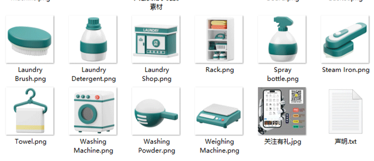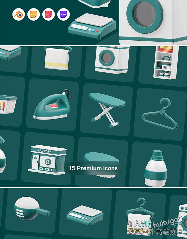 blender卡通洗衣服用品图标3D模型C4D洗衣机衣架FBX烫斗烫衣板OBJ