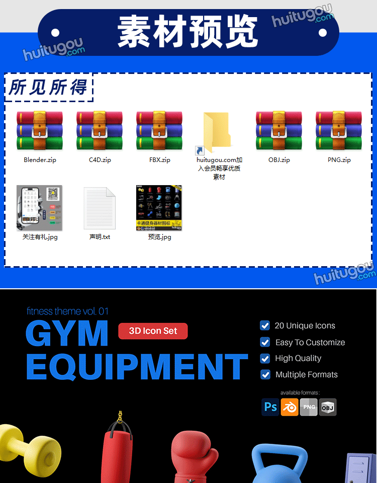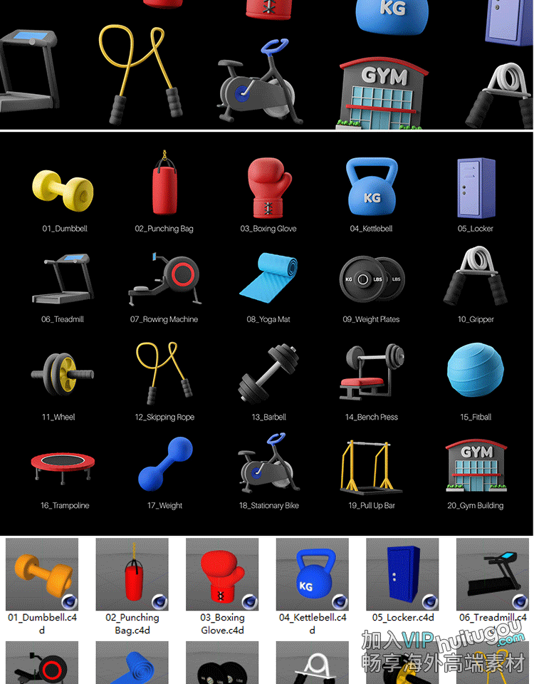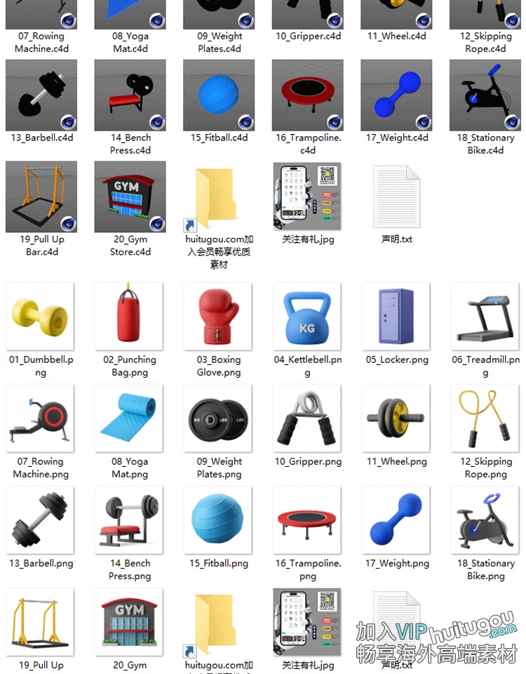 Blender卡通健身器材图标模型C4D哑铃瑜伽垫跳绳FBX静态自行车PNG