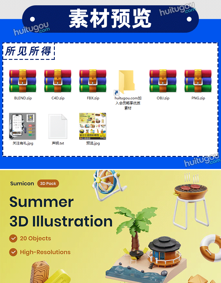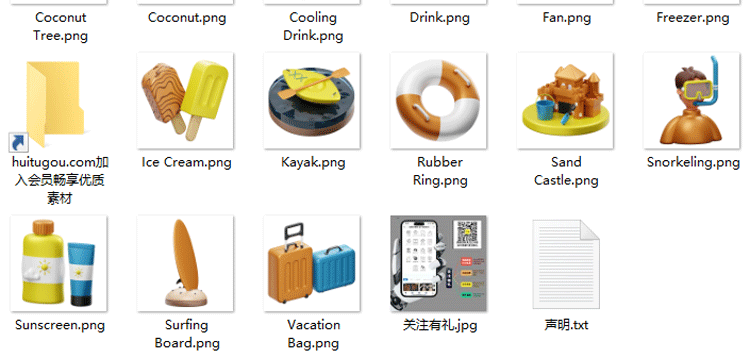 blender卡通夏日图标模型C4D小风扇西瓜FBX冲浪板帆船菠萝OBJ文件