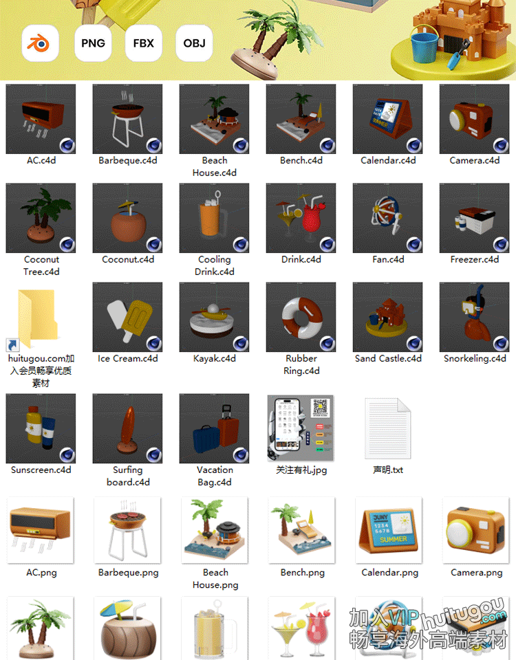 Blender夏日主题图标模型C4D冷饮椰树椰子FBX划艇相机泳圈OBJ素材