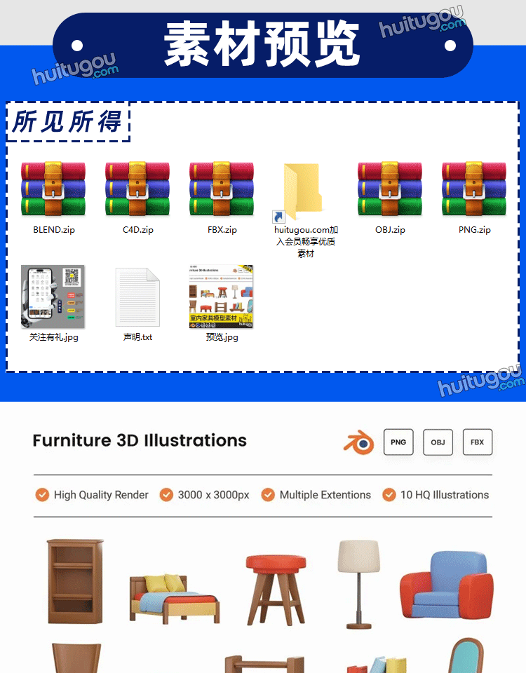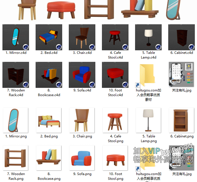 blend卡通室内家具模型素材C4D椅子沙发床镜子FBX台灯柜子PNG图标